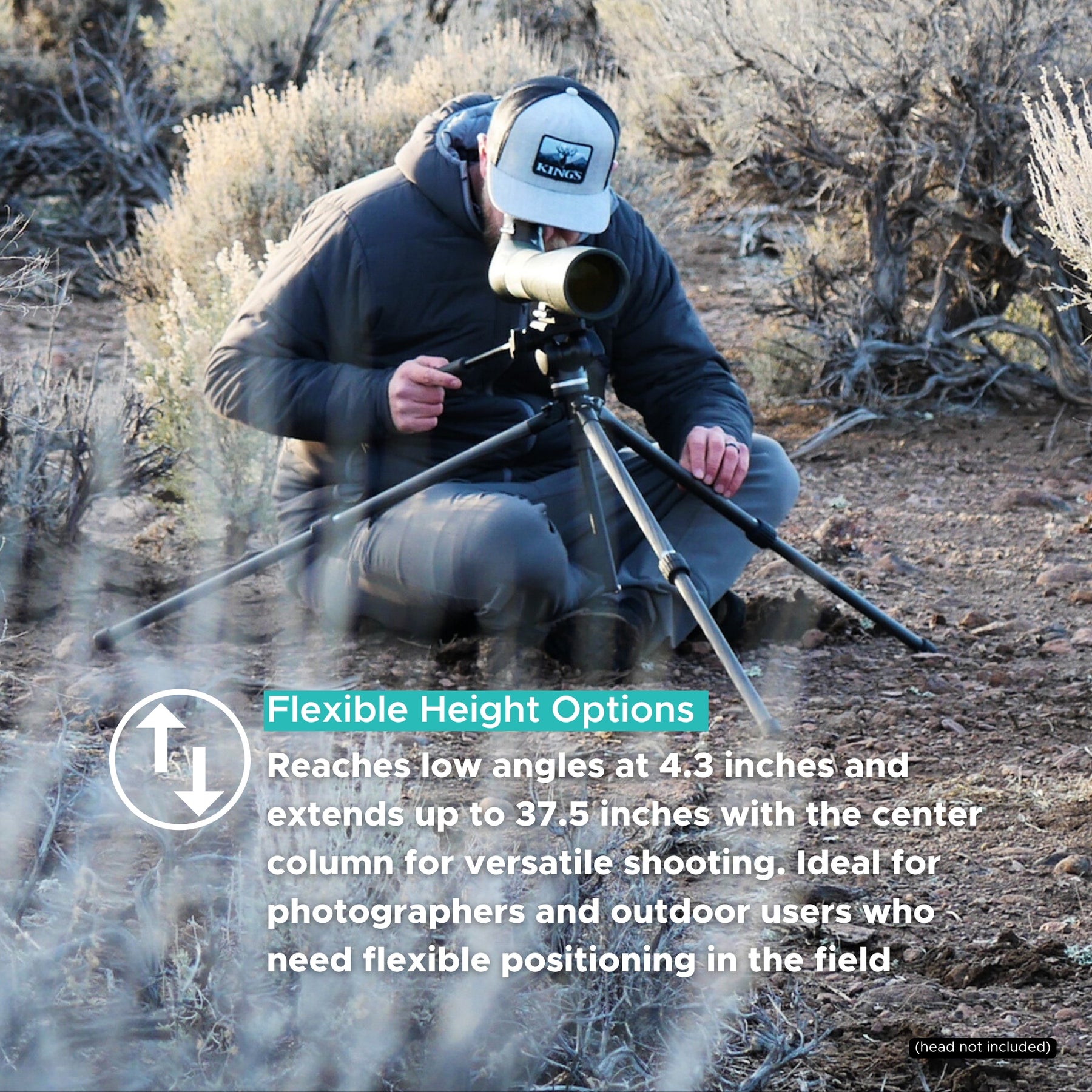 While the tripod is primarily designed for use while sitting or kneeling, it can also be utilized while standing, especially if your camera has a flip-out screen. The 3 position adjustable legs allow for precise placement especially on uneven terrain.