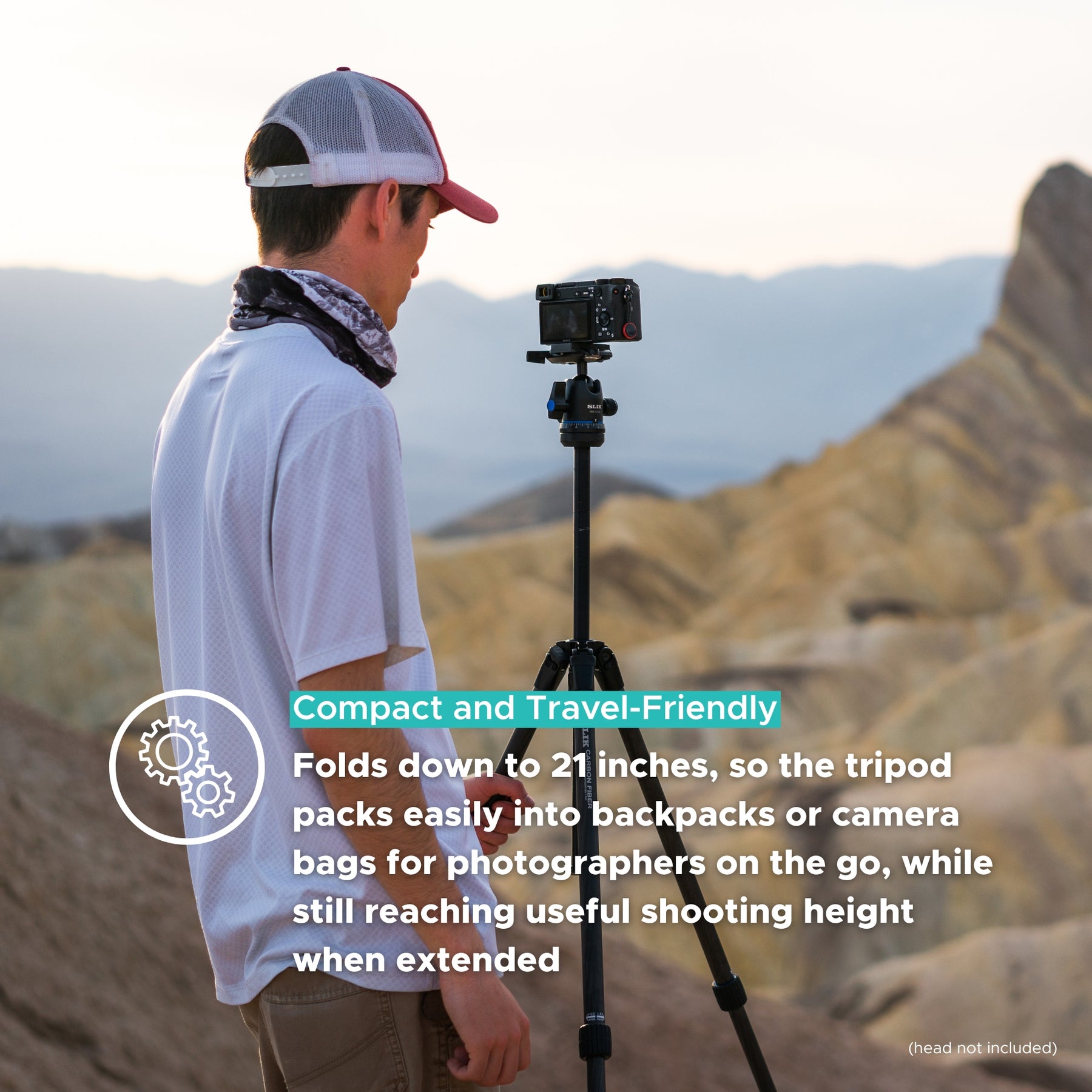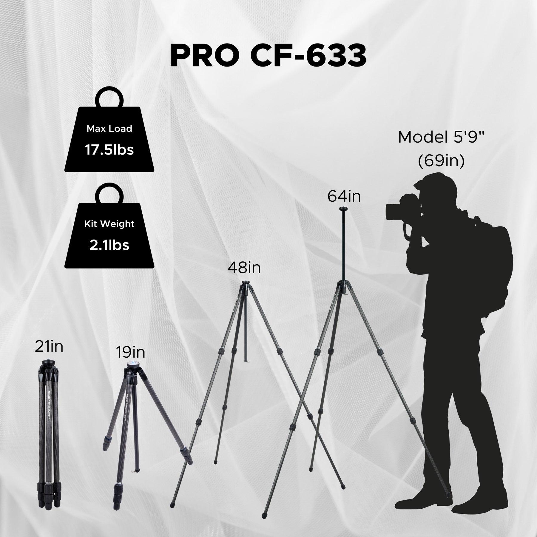 The SLIK PRO CF-633 weighs just 2.1 lbs. making it an easy backpacking companion. It extends to a max height of 64 inches and folds down to a compact 21 inches for travel.