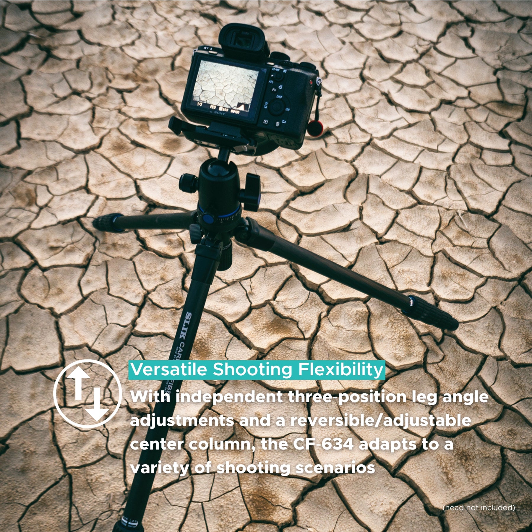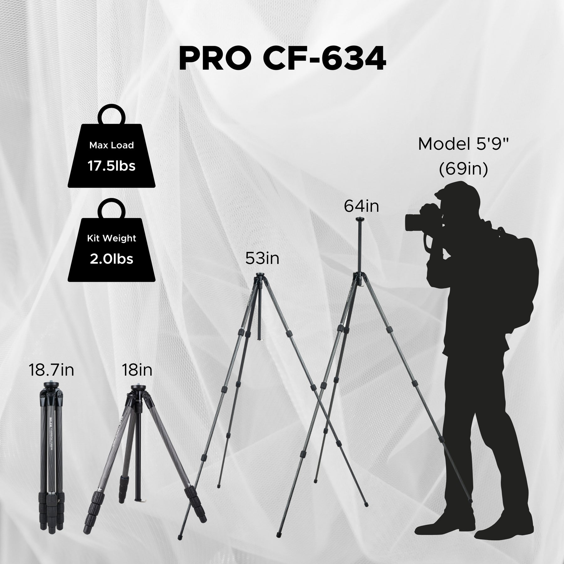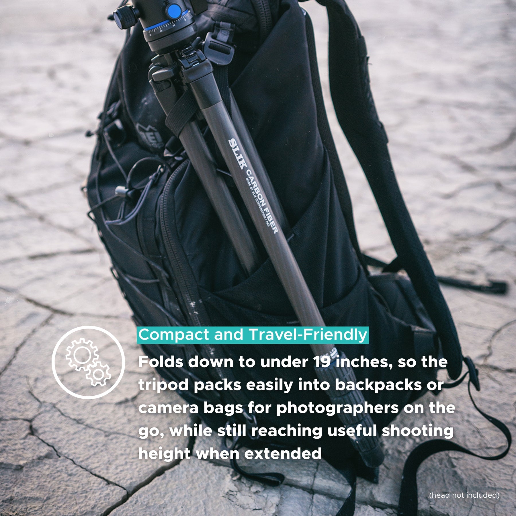 The SLIK PRO CF-634 weighs just 2 lbs., making it an easy backpacking companion. It extends to a height of 62.6 inches and folds down to a compact 18.7 inches for travel.