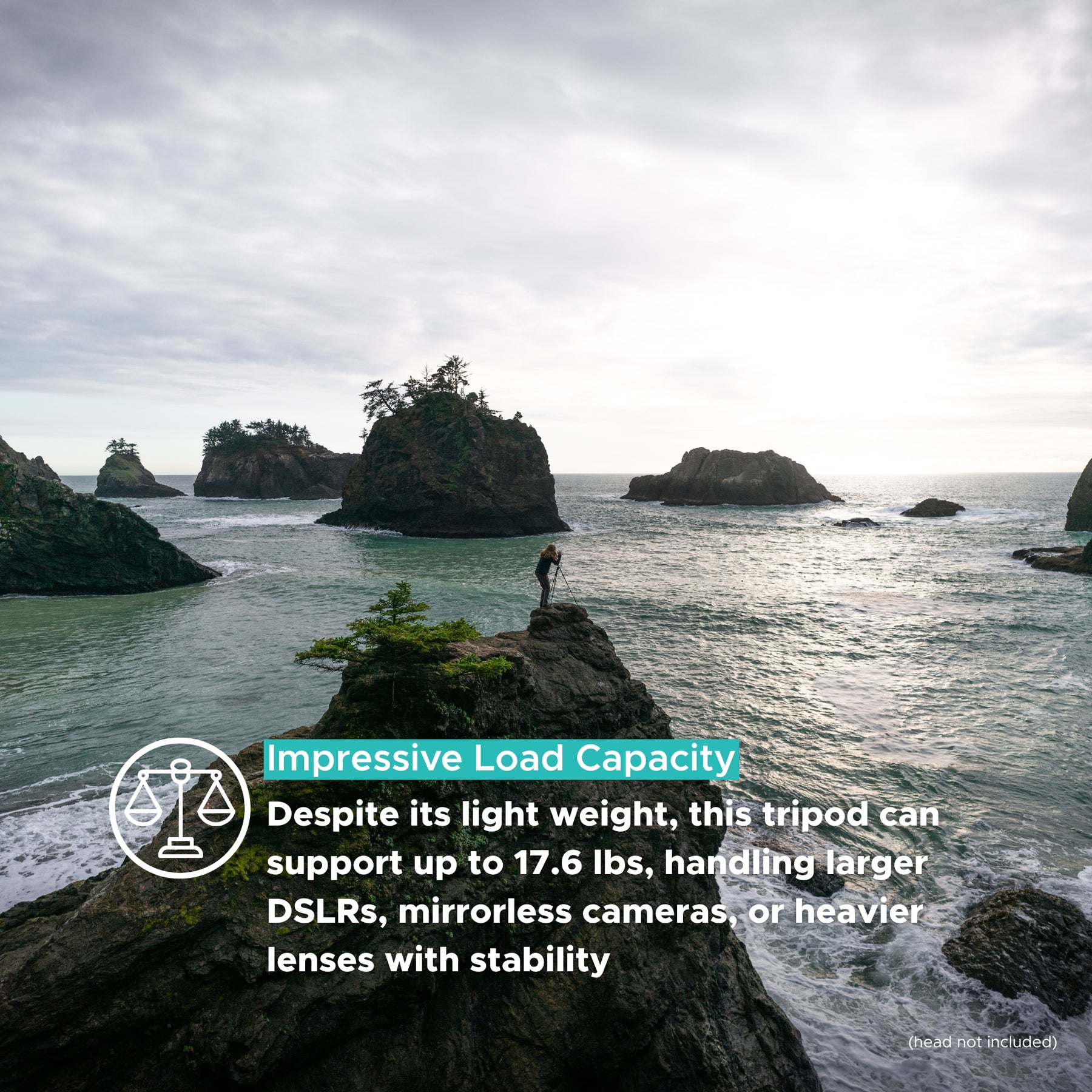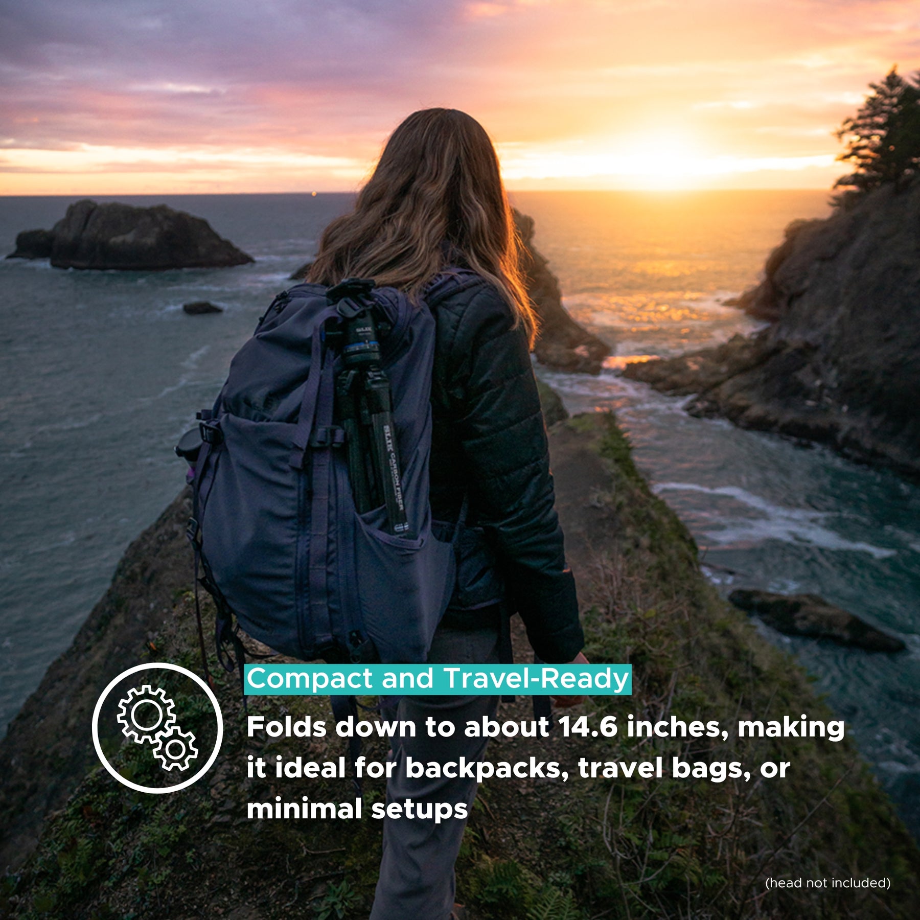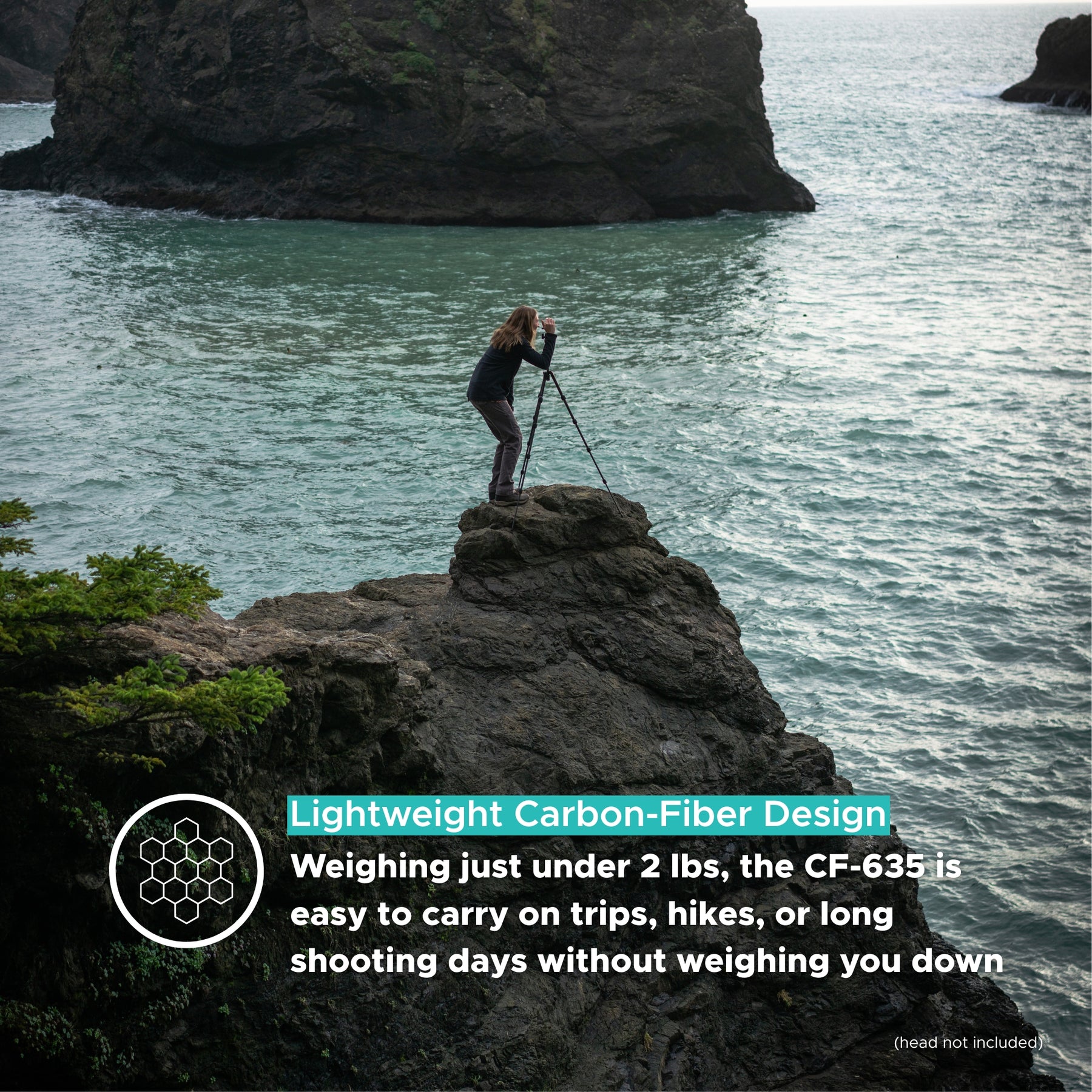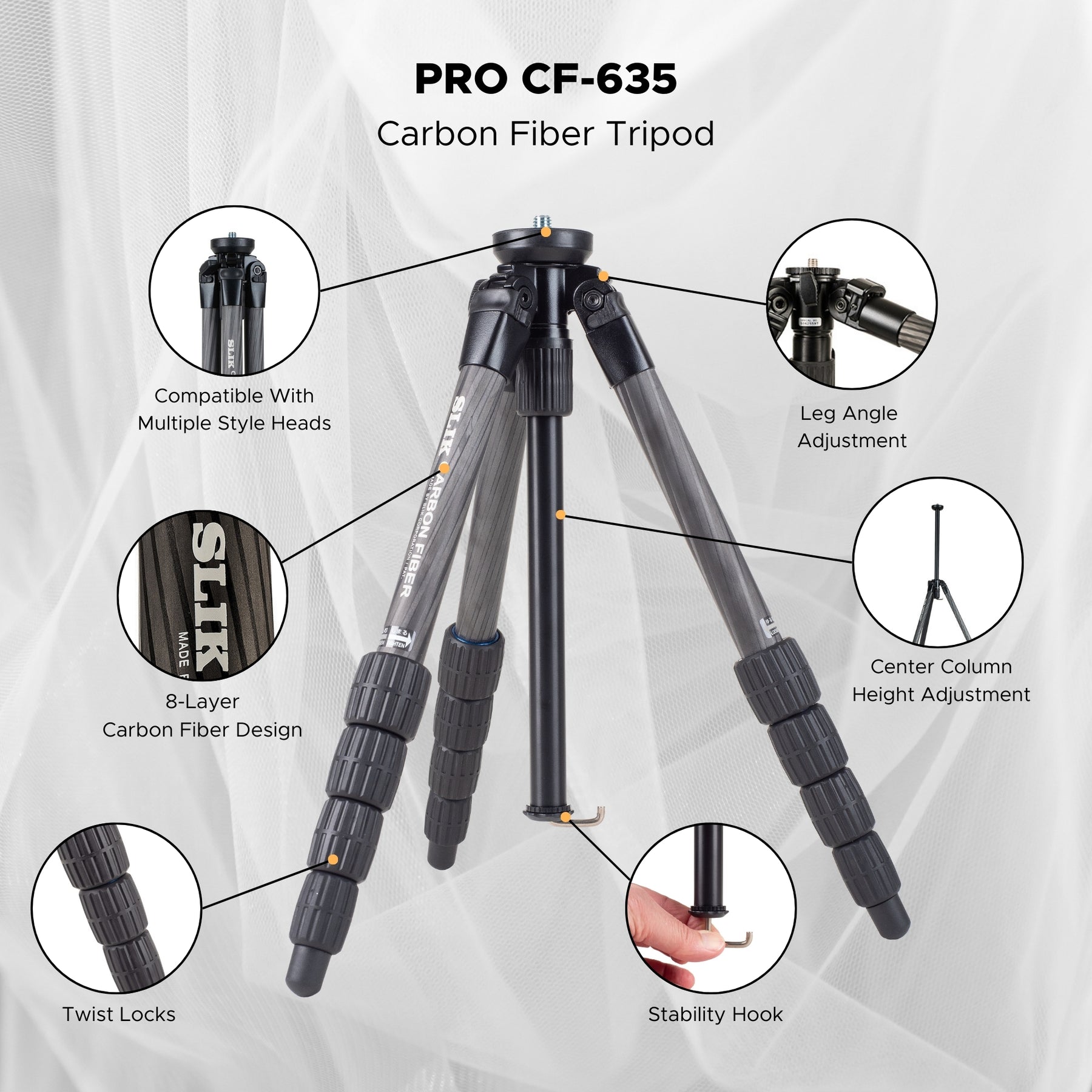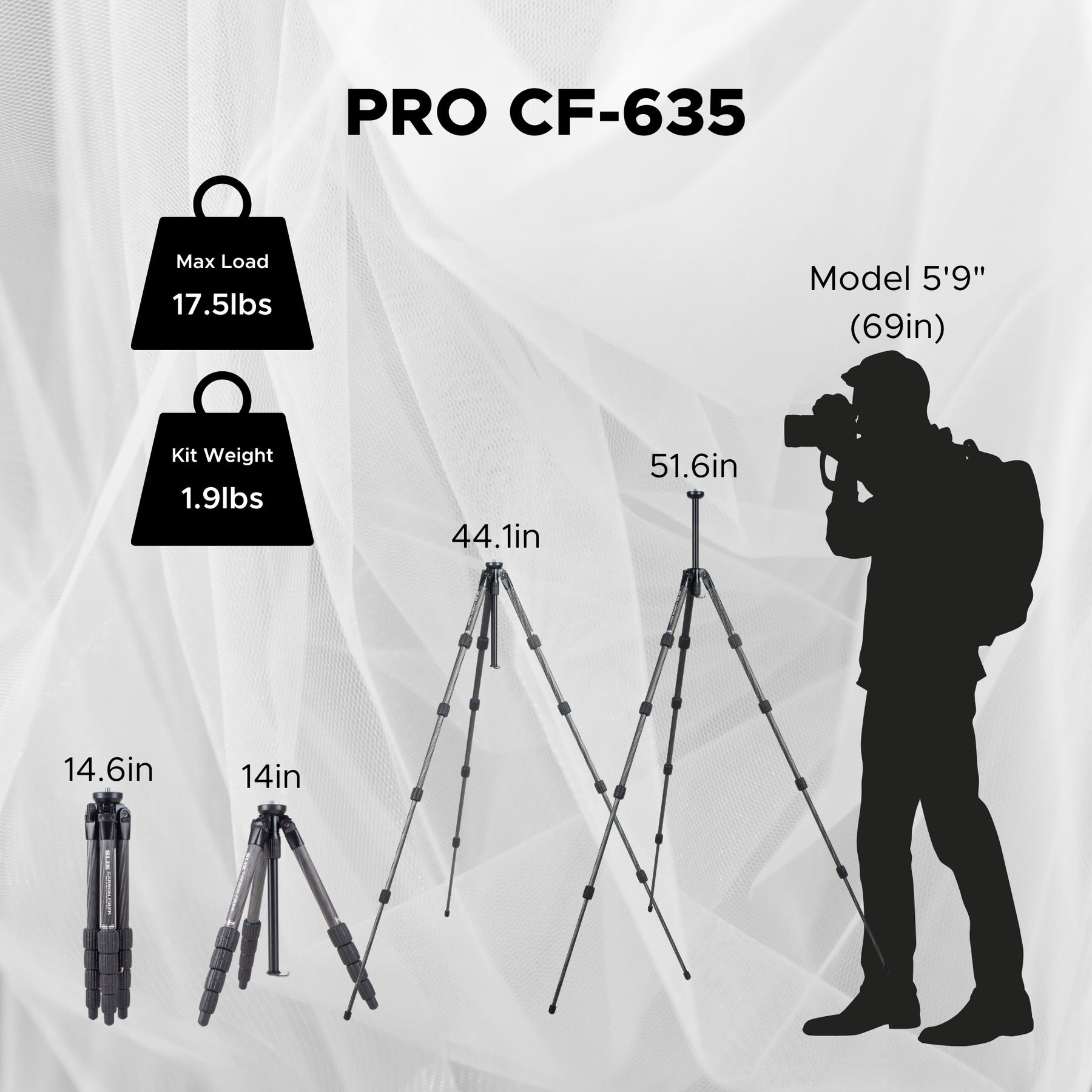 The SLIK PRO CF-635 is our smallest CF tripod. It has a max height of 51.6 inches, folds down to 14.6 inches, and weighs only 1.9 lbs, making it a great choice for extended hikes into the back country.