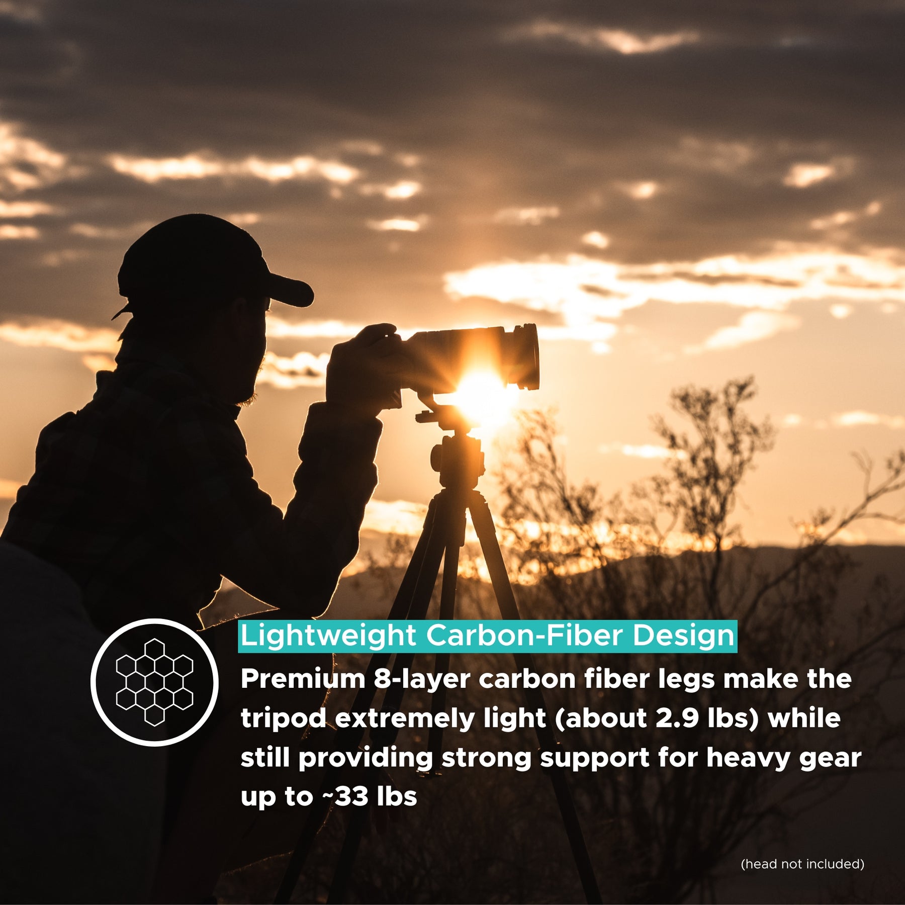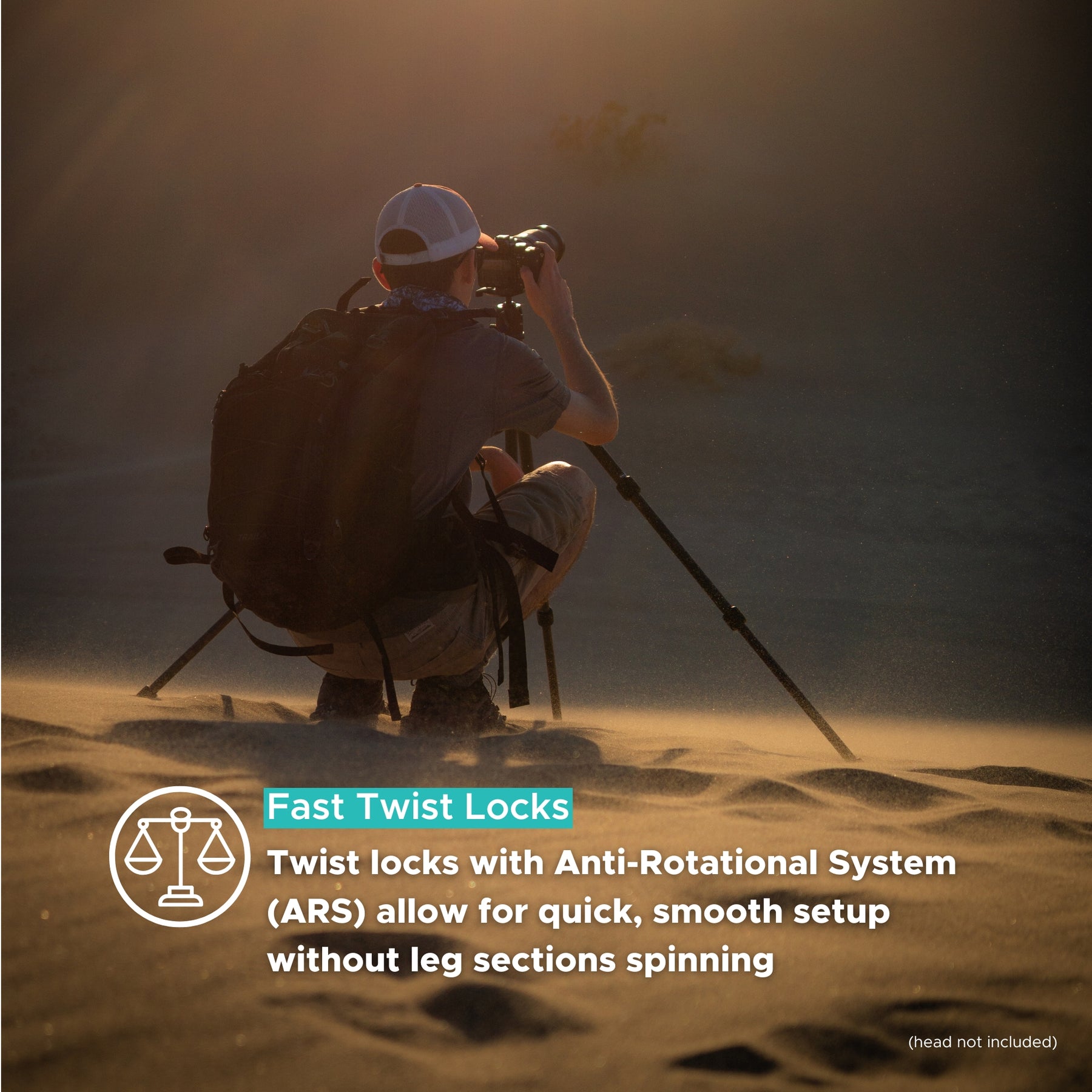 The 8-layer carbon fiber legs have 3 sections that quickly deploy and lock using 2 twist locks that are easy to operate with or without gloves. The legs Anti-Rotational System (ARS) is crafted into the leg locks and does not permit individual leg sections to rotate inside each other.