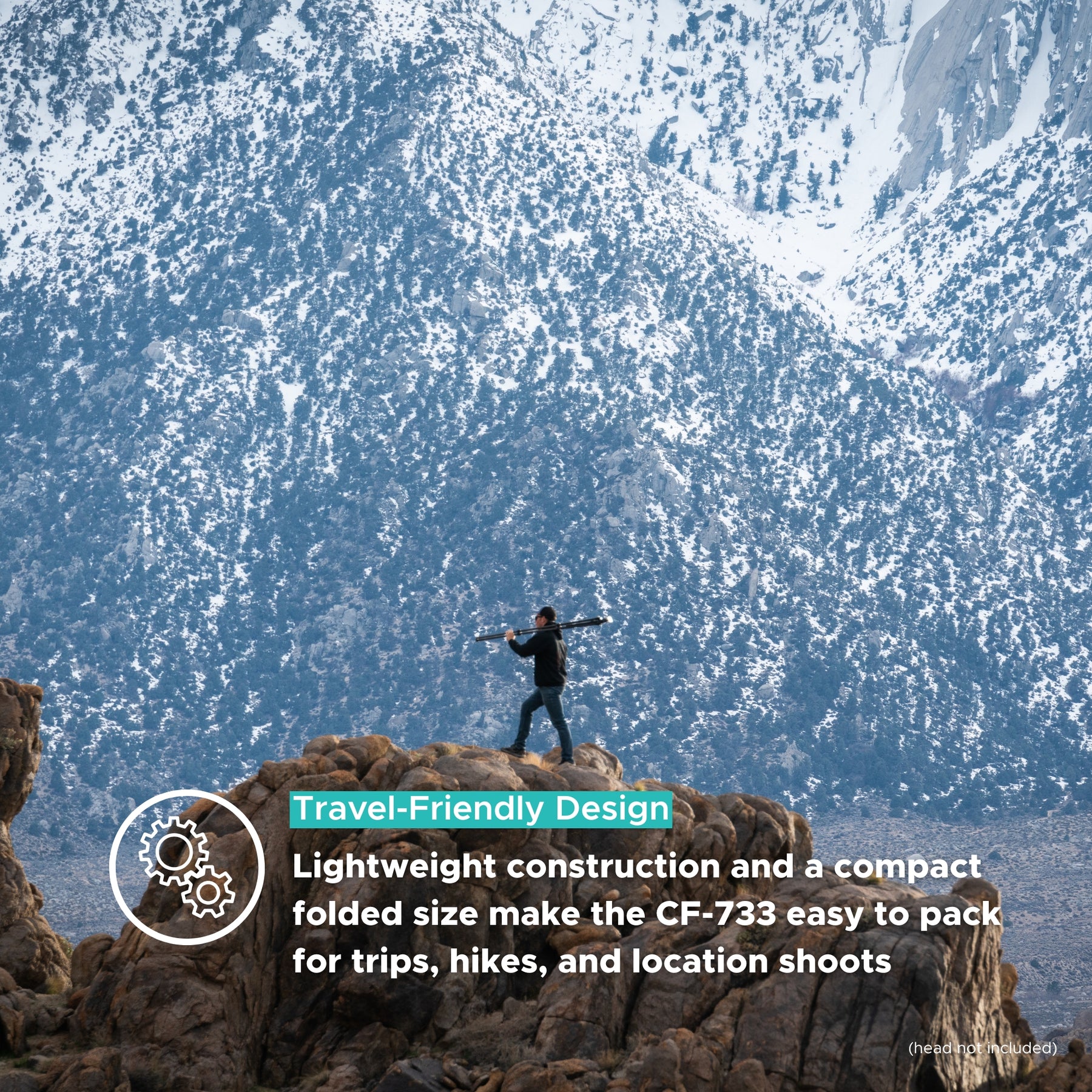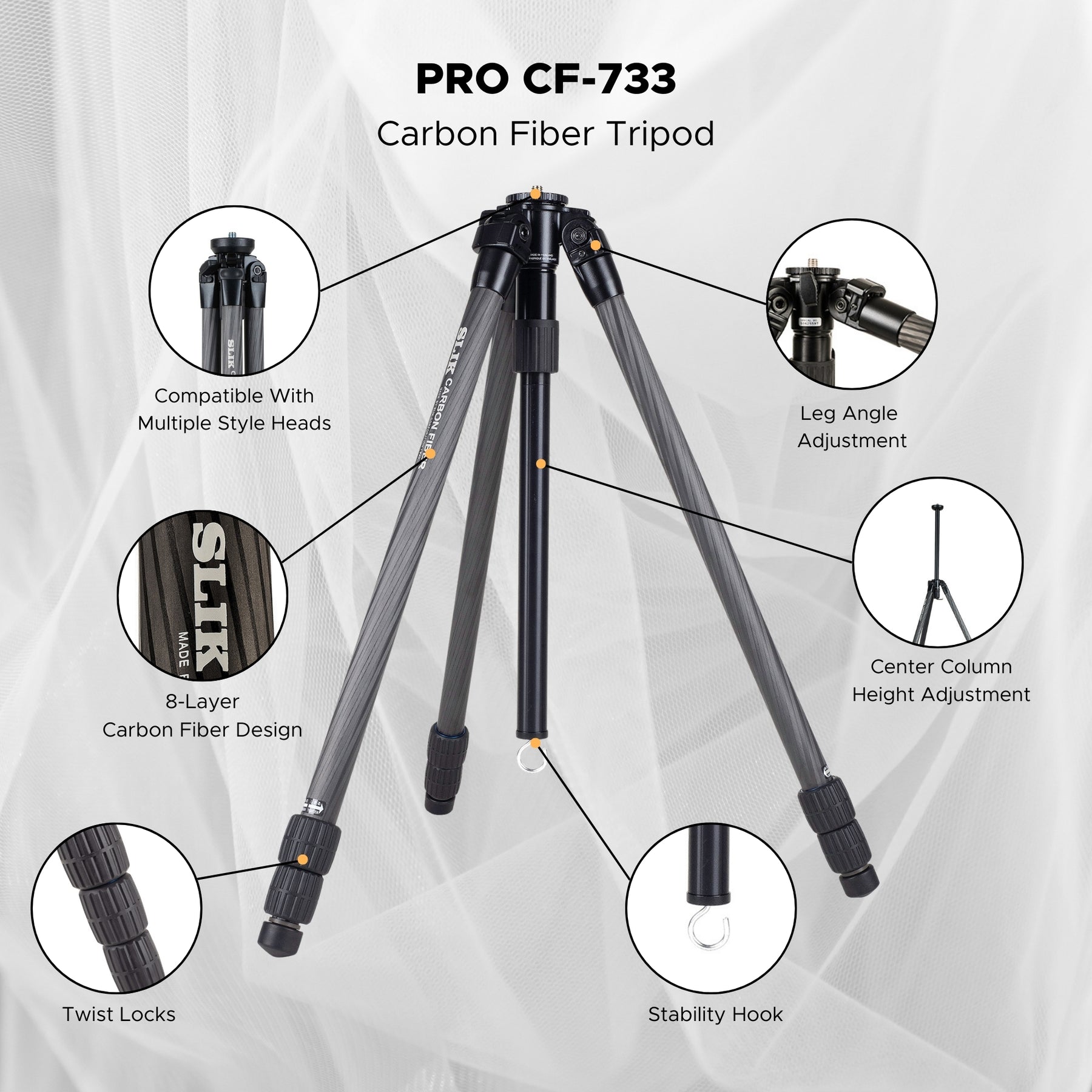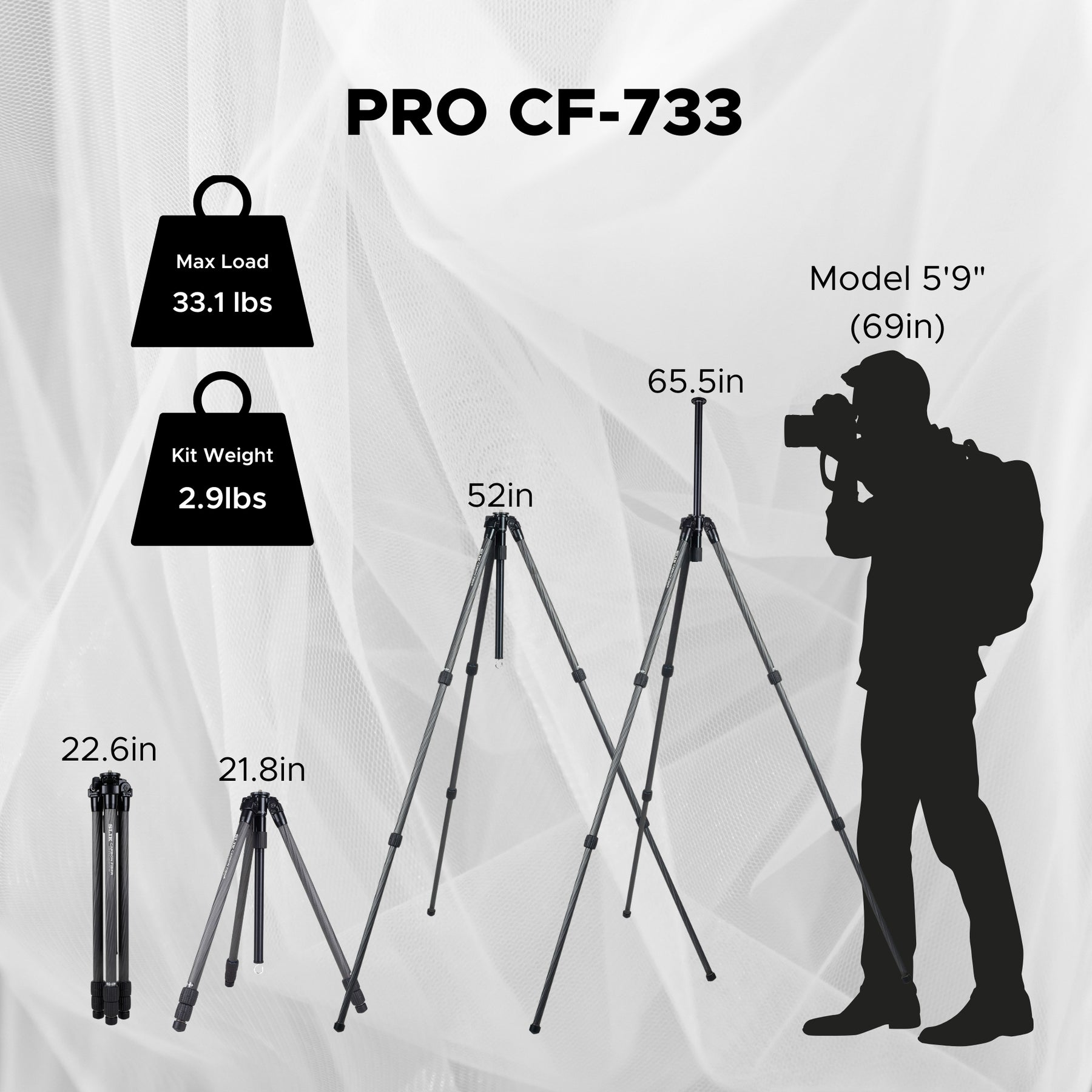 The Slik PRO CF-733 is a full-size tripod extending to 66 inches and folds down to a compact 22.6 inches. It weighs 2.9 lbs and can support up to 33.1 lbs.