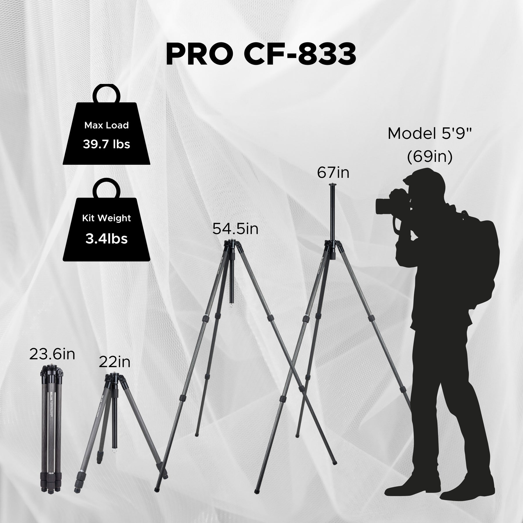The Slik PRO CF-833 is a full-size tripod extending to 67.3 inches and folds down to a compact 23.6 inches. It weighs 3.4 lbs and can support up to 39.7 lbs.