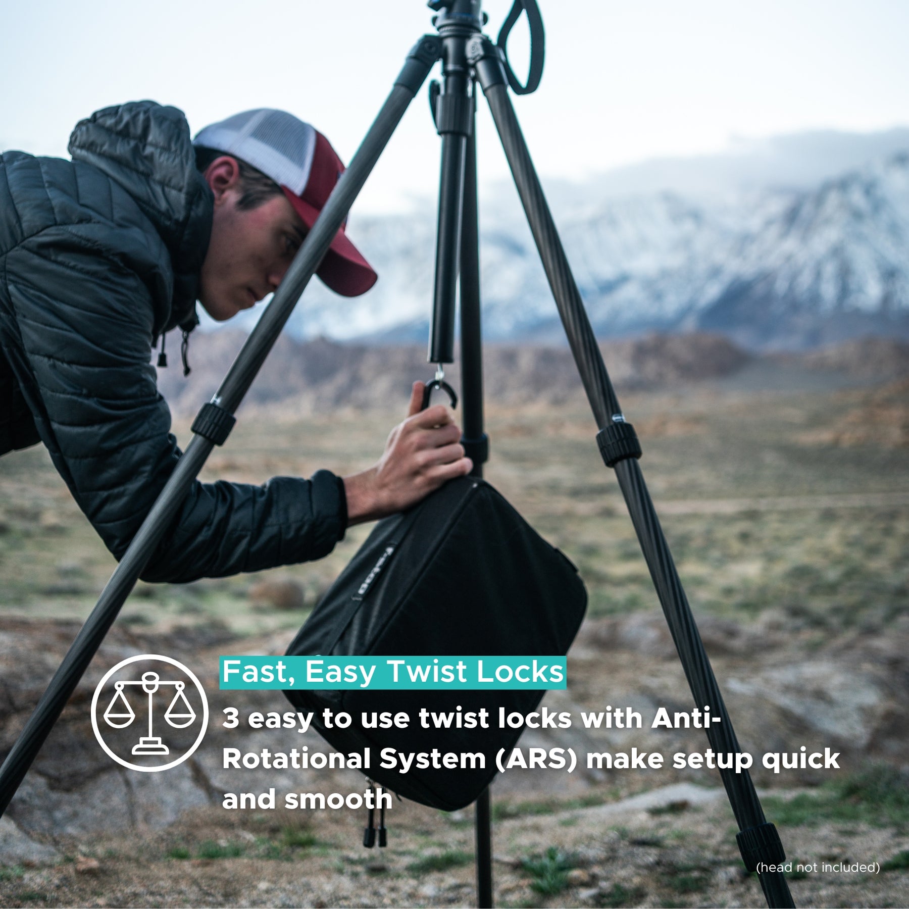 The 8-layer carbon fiber legs have 3 sections that quickly deploy and lock using 2 twist locks that are easy to operate with or without gloves. The legs Anti-Rotational System (ARS) is crafted into the leg locks and does not permit individual leg sections to rotate inside each other.