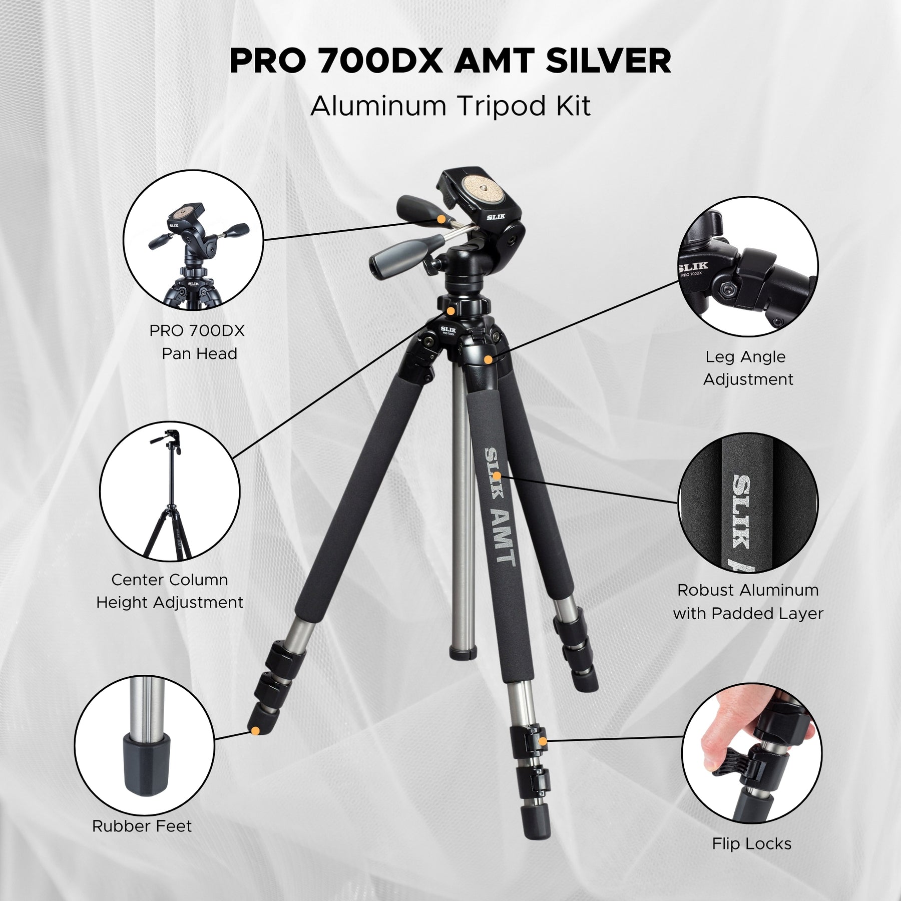 It can handle the weight of a professional full-frame DSLR camera with a heavy long telephoto lens. It offers photographers the strength and stability they need on flat and uneven surfaces. SLIK’s exclusive AMT super titanium alloy legs make the PRO 700 DX tripod rock steady yet lighter than its competitors with similar max weight capacities.