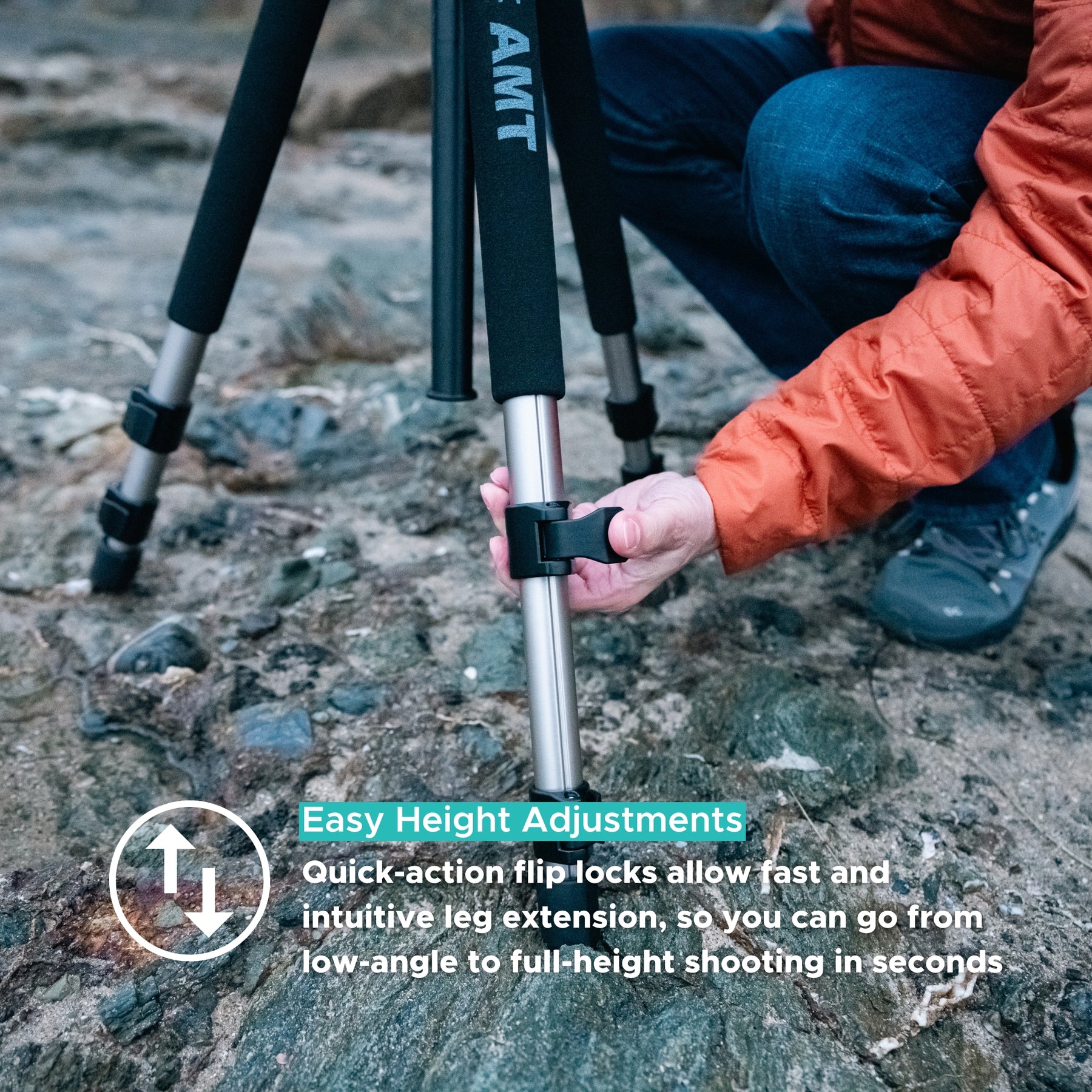“What’s so great about AMT alloy?” It has 40% greater strength to weight ratio than standard aluminum. The legs weigh less and are stronger than the standard aluminum used in most of today’s tripods. All at a price you cannot beat.